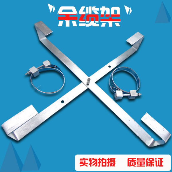3、用钢带抱箍缠绕电杆,并用螺栓将余缆架紧固到钢带抱箍上,注意钢带要叠压,防止滑脱。